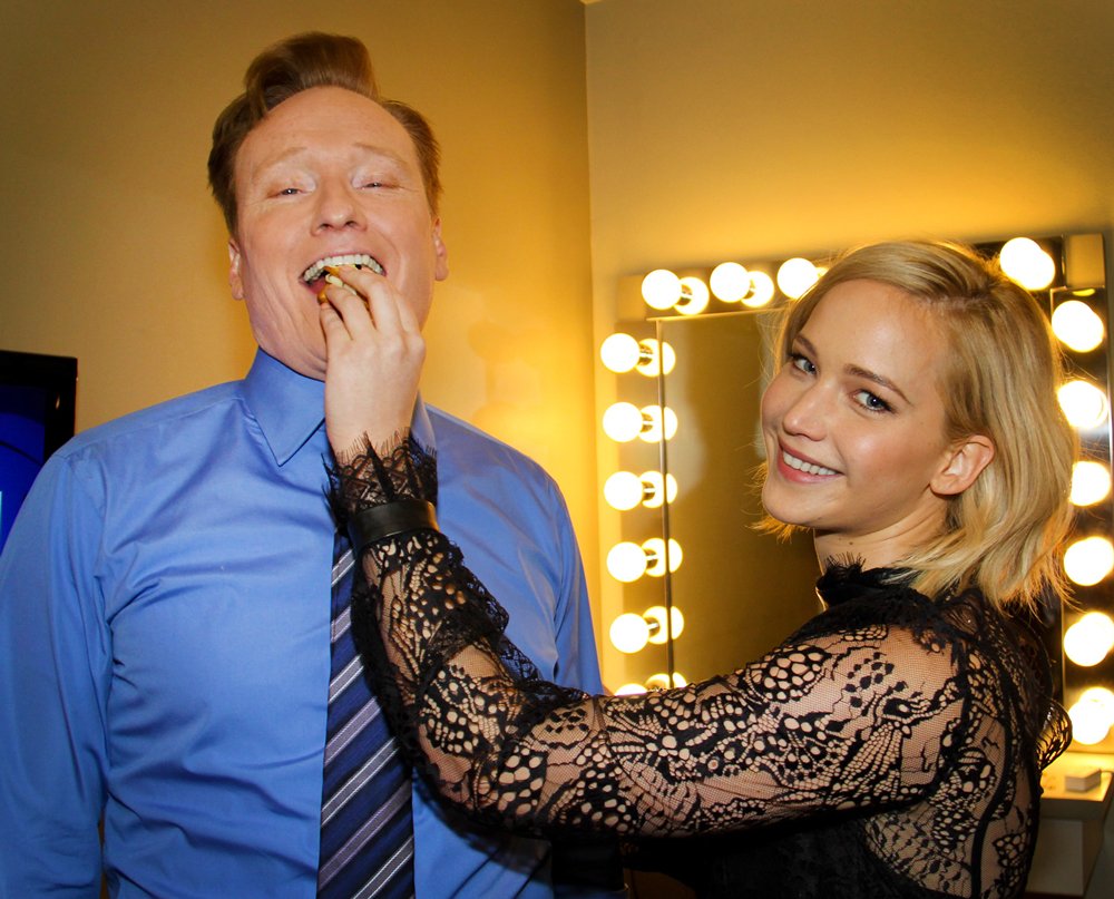 Oddly, "Feed Conan cheese and crackers" was on JLaw's rider.